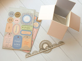 2. Папір і декоративні елементи (зокрема висічки, чіпборд), скраппапір для клапанів кардбокса і створення об'ємної композиції.